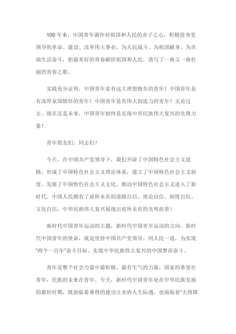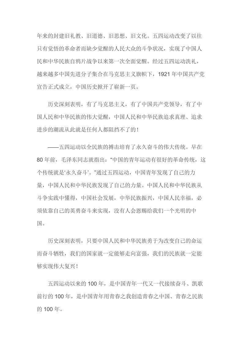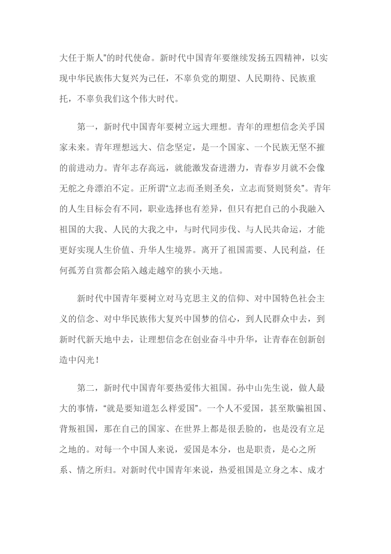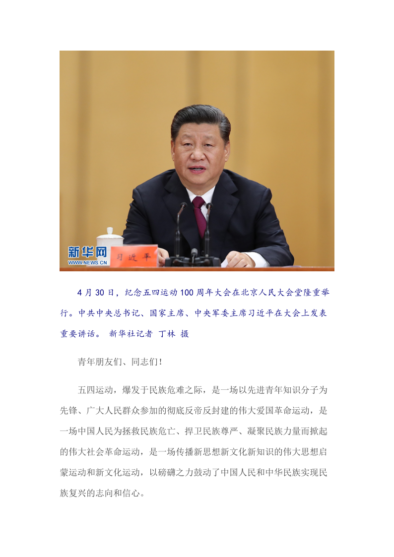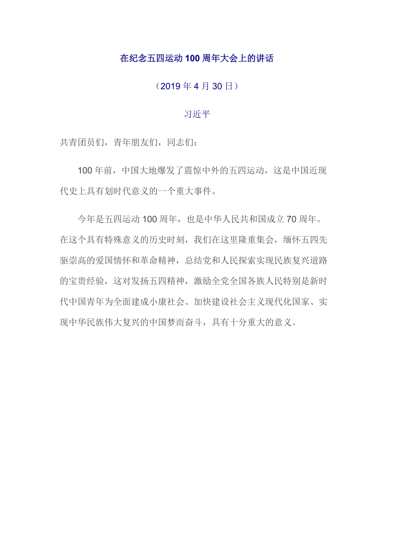 2019年4月30日在纪念五四运动100周年大会上的讲话