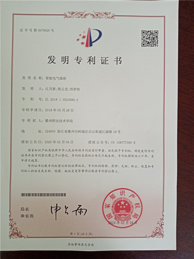 发明专利《智能电气插座》,ZL 2018 1 0523686.0