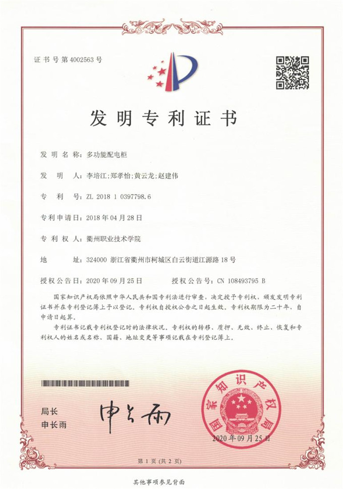 发明专利《多功能配电柜》,ZL 2018 1 0397798.6