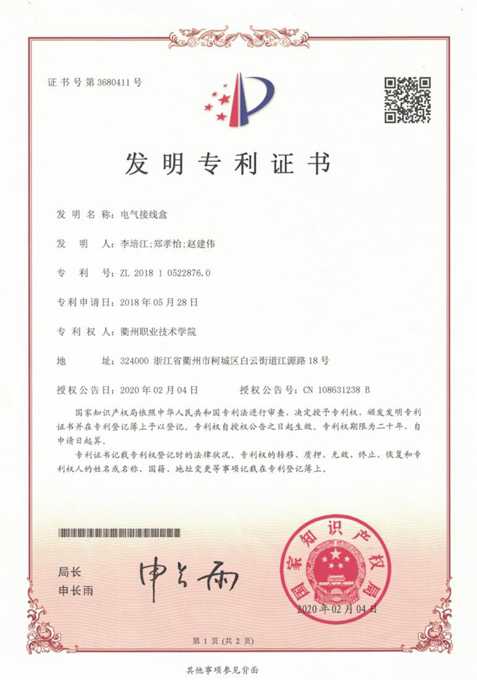 发明专利《电气接线盒》,ZL 2018 1 0522876.0