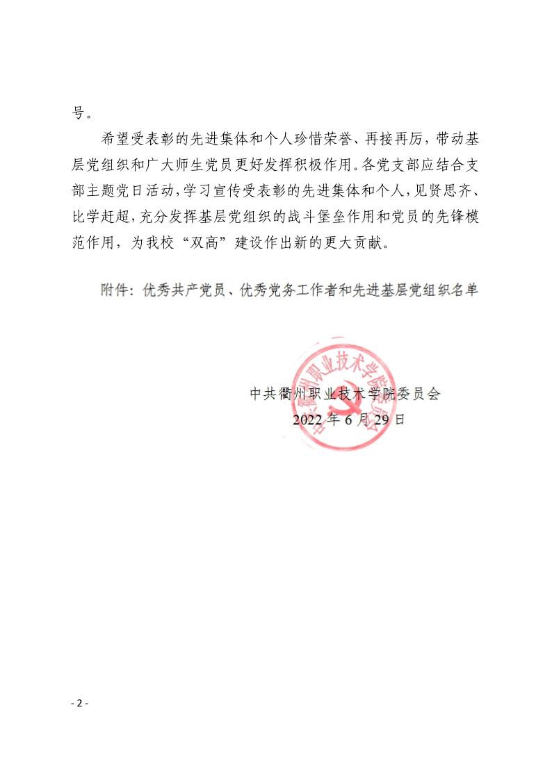 衢职院党〔2022〕25号-关于表彰优秀共产党员、优秀党务工作者和先进基层党组织的决定