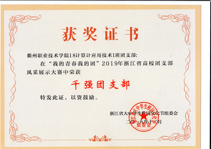 18级计算机应用技术1班团支部在“我的青春我的国”2019年浙江省高校团支部风采展示大赛中获千强团支部(奖状)