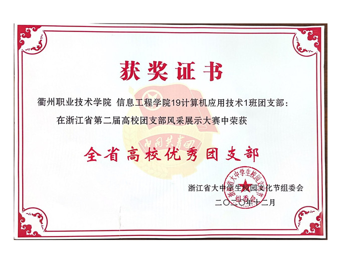 19计算机应用技术1班团支部在浙江省第二届高校团支部风采展示大赛中获全省高校优秀团支部(奖状)