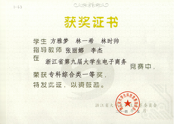 浙江省第九届大学生电子商务竞赛专科综合类一等奖