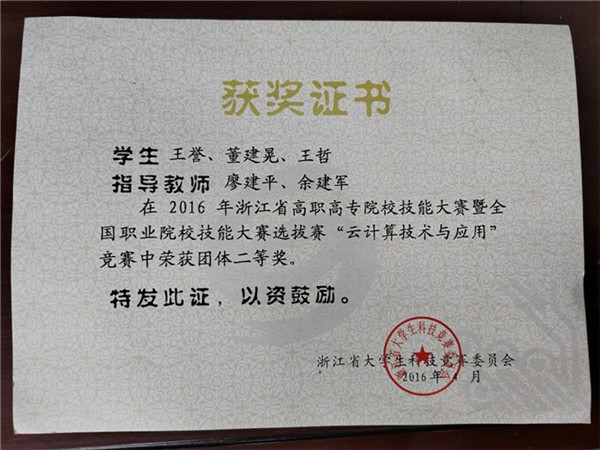 浙江省高职高专院校技能大赛“云计算技术与应用”竞赛团体二等奖