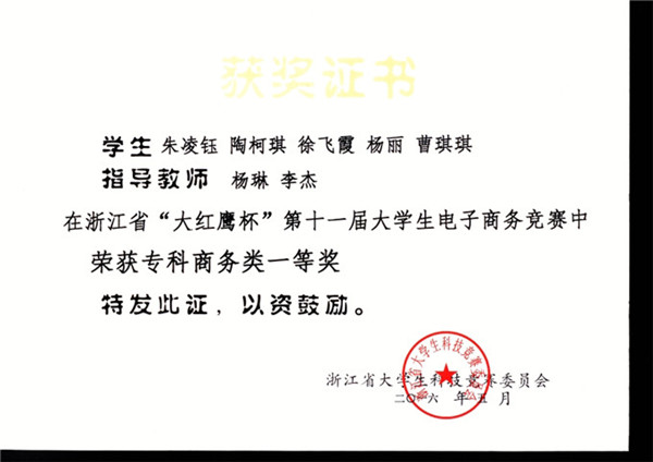 浙江省“大红鹰杯”第十一届大学生电子商务竞赛专科商务类一等奖