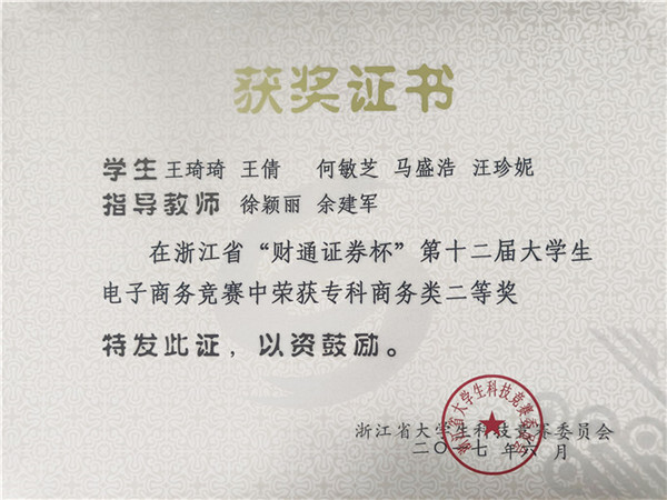 浙江省“财通证券杯”第十二届大学生电子商务竞赛专科商务类二等奖