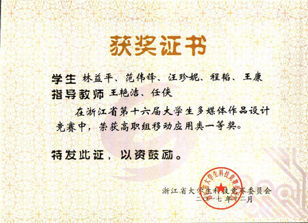 浙江省第十六届大学生多媒体作品设计竞赛高职移动应用一等奖