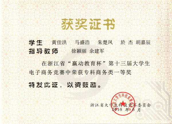 浙江省“赢动教育杯”第十三届大学生电子商务竞赛专科商务类一等奖