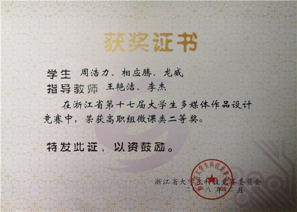 浙江省第十七届大学生多媒体作品设计竞赛获高职组微课类二等奖
