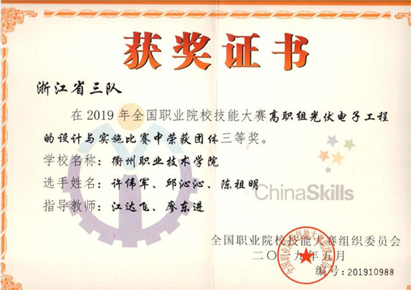全国职业院校技能大赛高职组光伏电子工程的设计与实施比赛中荣获团体三等奖