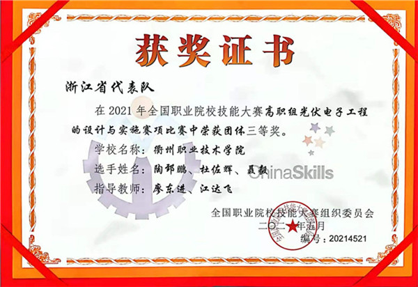 全国职业院校技能大赛高职组光伏电子工程的设计与实施比赛团体三等奖