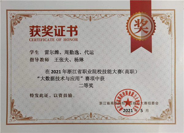 浙江省职业院校技能大赛(高职)“大数据技术与应用”赛项中获二等奖