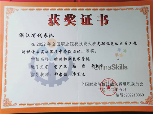 浙江省代表队(衢州职业技术学院)在2022年全国职业院校技能大赛高职组光伏电子工程的设计与实施比赛中荣获团体二等奖