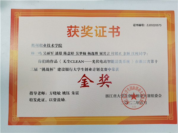 浙江省第十三届“挑战杯”建设银行大学生创业计划竞赛金奖
