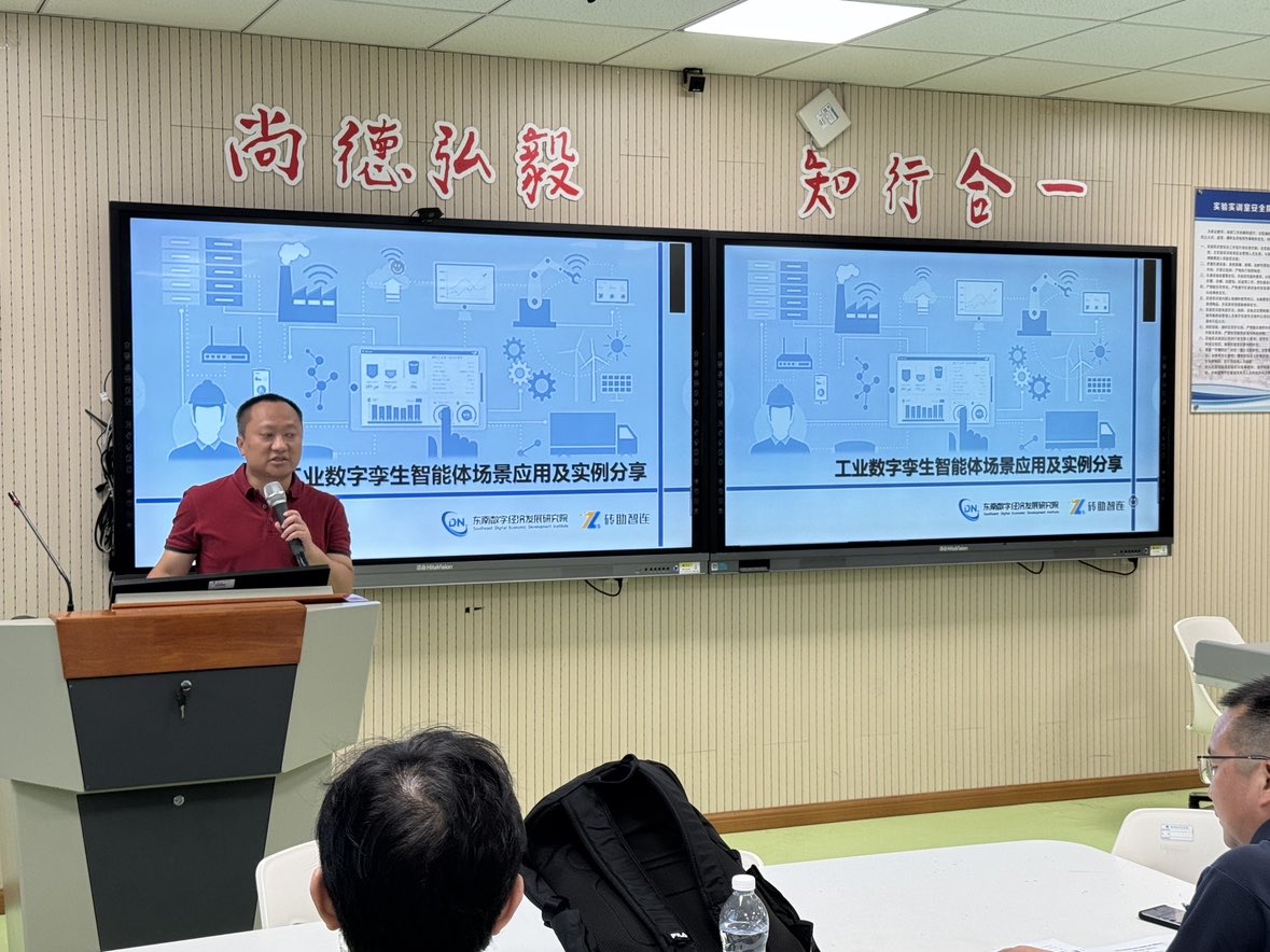 2025年10月10日下午,信息工程学院在理南107举办“信·师说”论坛专题报告会,特邀学校产业导师、浙江砖助智连科技有限责任公司总经理张文博士作题为《工业数字孪生智能体场景应用及实例分享》及崔浩亮博士作题为《工业数字孪生智能体建设》的专题报告。本次报告围绕工业数字孪生与智能体技术的前沿发展、体系架构及其在智能制造中的典型应用展开,为在场教师带来了一场理论与实践深度融合的技术盛宴。报告会由院长马文龙主持。