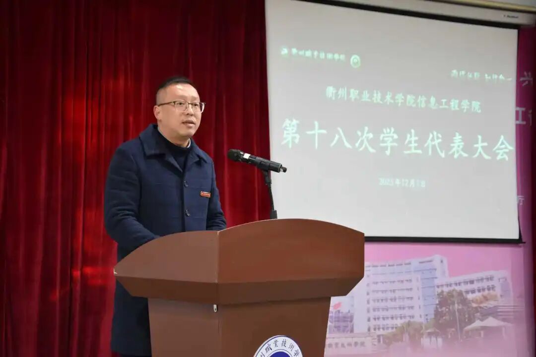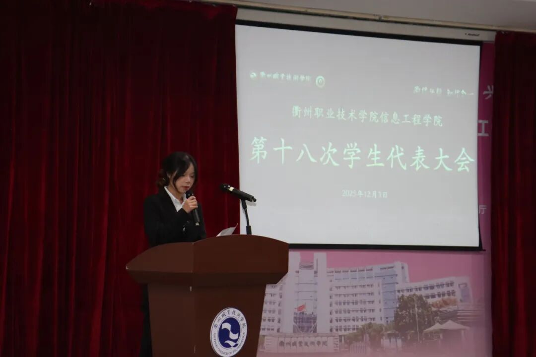 2025年12月3日,衢州职业技术学院信息工程学院第十八次学生代表大会在我校艺术多功能厅召开。学院党总支书记廖建平、党总支副书记谷明慧出席大会。我院学工办全体教师,学生会组织负责人及35名学生代表参加。